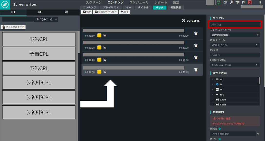 Arts Alliance Media(以下、AAM)のTMS「Screenwriter」にある「パック機能」は、この『繰り返し作業そのもの』を減らすための仕組みであり、複数の素材(DCP)を「素材セット」として登録し、必要なときにまとめて呼び出すことが可能です。(以下、シネアド・予告・館内案内など複数素材をまとめたものを、分かりやすく「素材セット」と表記します)