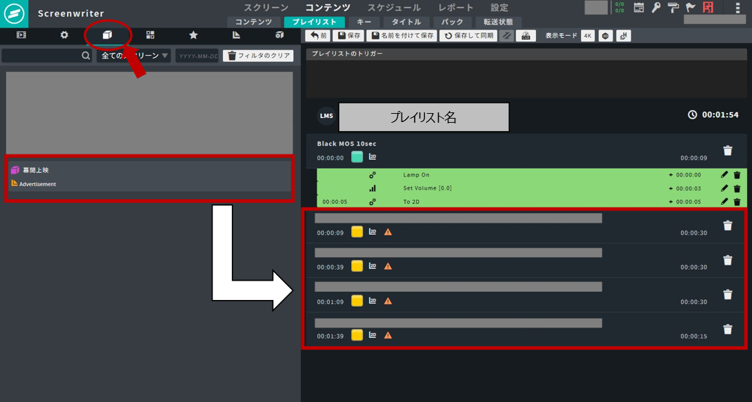 幕間上映時に毎回上映する、シネアドや予告が複数本あるなら、それを1パックにしておきます。プレイリスト作成時は、パックを入れるだけで完了します。
